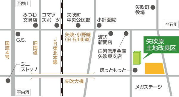 JR矢吹駅より東口を出て、南へ徒歩1.6km(約20分)